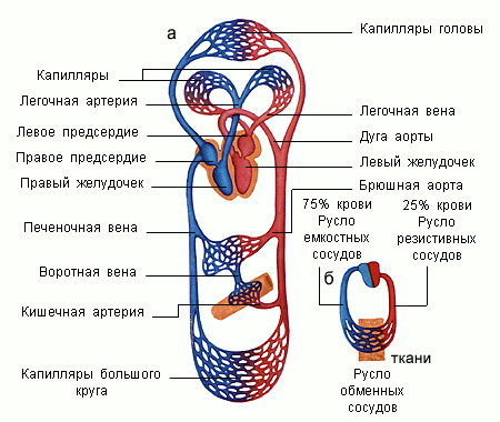 Сердце: а) схема кровообращения; б) распределение крови в сосудах различного типа.