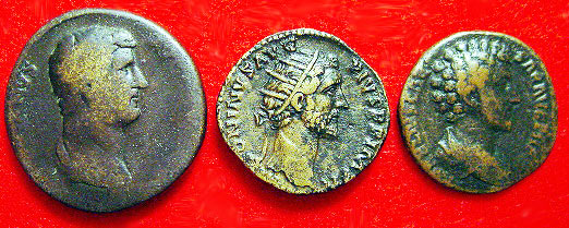 Сестерций императора Адриана (слева), дупондий Антонина Пия (в центре), асс Марка Аврелия (справа).