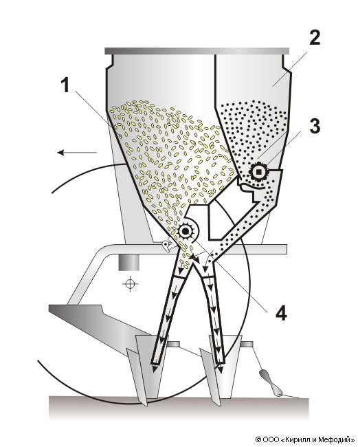 Технологическая схема льняной комбинированной сеялки: 1 — ящик для семян; 2 — ящик для туков; 3 — катушечно-штифтовый высевающий аппарат; 4 — катушечный высевающий аппарат.