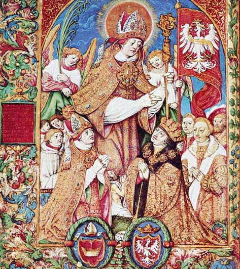 Станислав Самостржельник (1490-1541). Святой Станислав с королем Сигизмундом I Старым, епископом Томицким, М. и К. Шидловицкими. Титульний лист к книге Яна Длугоша «Каталог…». 1535 год. Пергамент. Варшавская национальная библиотека.