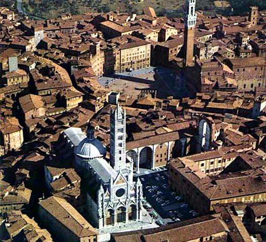 Сиена. Панорама города. На переднем плане Кафедральный собор (слева), на заднем плане: площадь Кампо и Дворец Публико (справа).