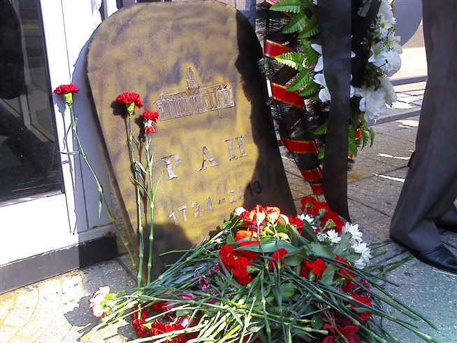 Символическое надгробие РАН у здания Госдумы утром 5 июля 2013 накануне второго чтения законопроекта о реформе государственных академий. Фото Татьяны Пичугиной