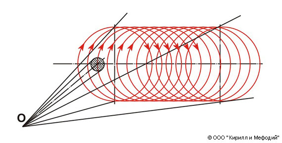 Перемещение луча при поступательно-коническом сканировании: переносное движение луча — колебательное, относительное — вращательное (здесь — со значительно большей скоростью).