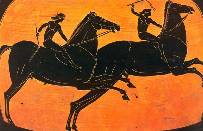 Скачки. Рисунок на панафинейской амфоре. Начало 5 в. до н. э. Лондон, Британский музей.
