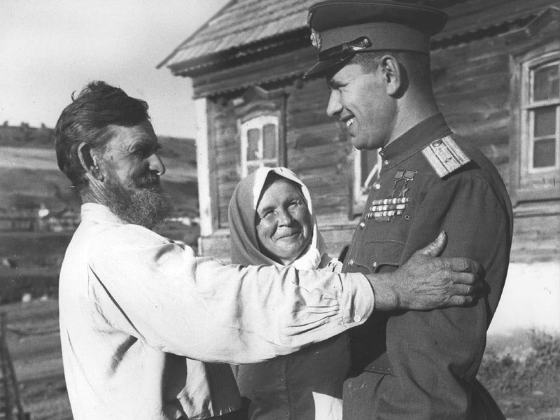 Возвращение с фронта летчика, дважды Героя Советского Союза Н.М. Скоморохова. 1945 год.