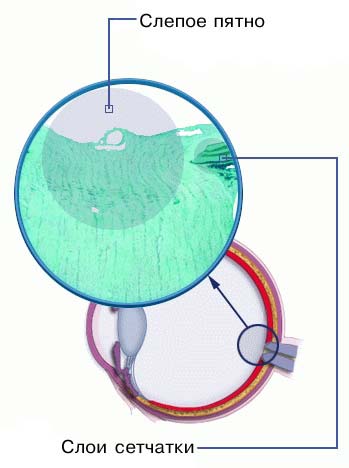 Слепое пятно образуется на месте выхода зрительного нерва в сетчатке, где отсутствуют фоторецепторы.