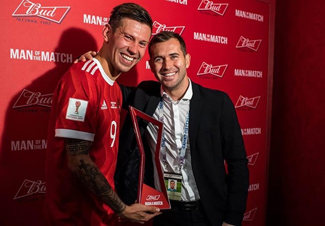 Нападающий сборной России Федор Смолов признан лучшим игроком матча Россия — Новая Зеландия и получил из рук Александра Кержакова приз BUD AF Man of the Match. 17 июня 2017 года. Источник: championat.com