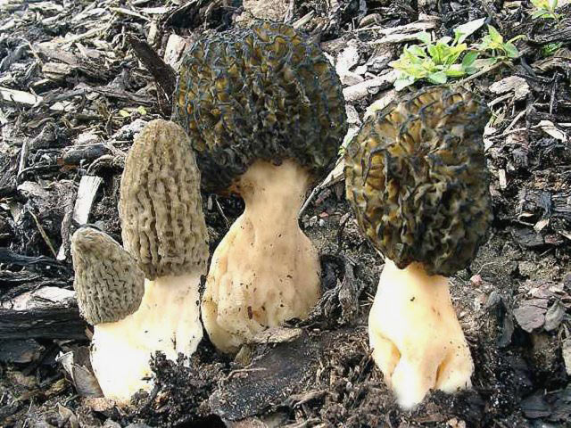Сморчок конический (Morchella conica). Шляпка имеет ячеистую структуру, слита с ножкой, внутри полая.