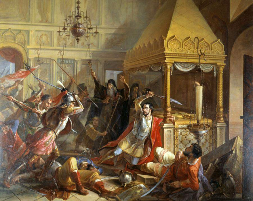 Василий Кузьмич Демидов (ум. 1848). Предсмертный подвиг князя М.К. Волконского, сражающегося с ляхами в Пафнутьевском монастыре в Боровске в 1610 году. 1842 год. Холст, масло. Калужский художественный музей.