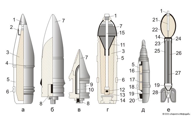 Снаряды артиллерийские: а — фугасный; б — бронебойный (калиберный); в — бронебойный (подкалиберный); г — кумулятивный; д — зажигательный; е — реактивный; 1 — взрыватель; 2 — головная часть; 3 — взрывчатое вещество; 4 — центрующее утолщение; 5 — корпус; 6 — ведущий поясок; 7 — баллистический наконечник; 8 — трассер; 9 — поддон; 10 — сердечник; 11 — воронка; 12 — капсюль-детонатор; 13 — детонатор; 14 — дно; 15 — трубка; 16 — сегмент; 17 — прокладка; 18 — замедлитель; 19 — диафрагма; 20 — вышибной заряд; 21 — дополнительный детонатор; 22 — корпус боевой части; 23 — воспламенитель; 24 — электрозапал; 25 — камера сгорания; 26 — пороховой заряд; 27 — провода; 28 — стабилизатор.