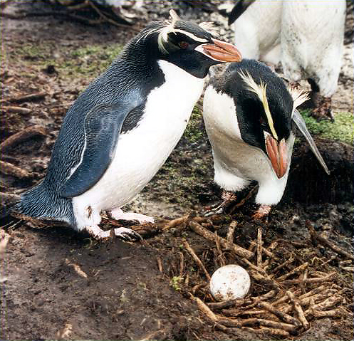 Пара снэрских хохлатых пингвинов у гнезда с яйцом.