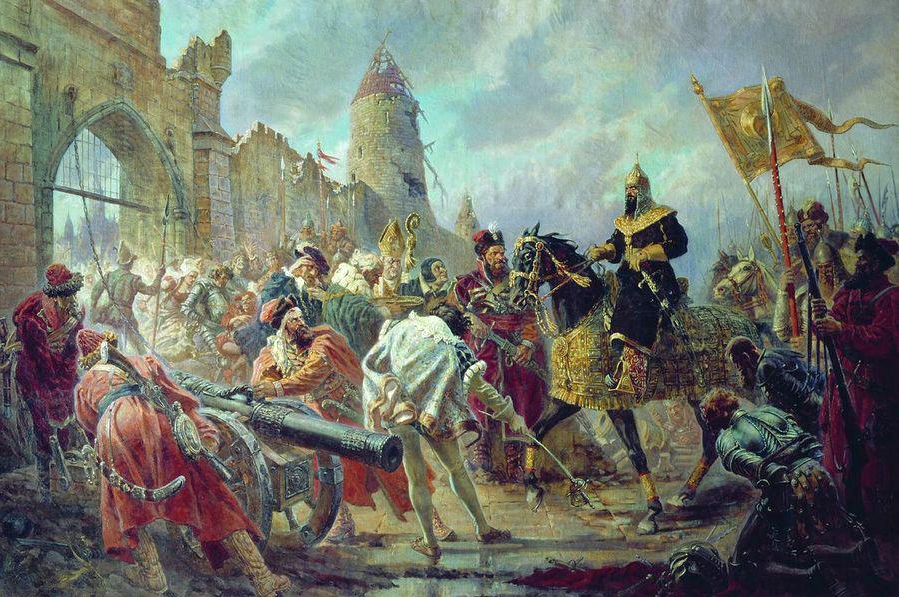 П.П. Соколов-Скаля. Взятие Иваном Грозным ливонской крепости Кокенгаузен. 1937-1943 годы. Холст, масло. Русский музей, Петербург.