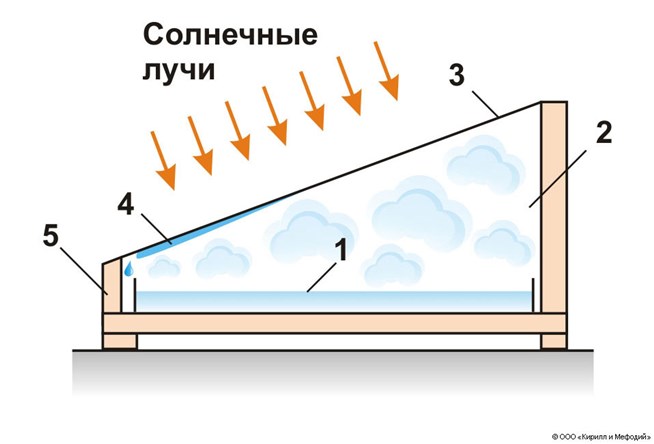 Схема солнечного опреснителя типа «горячий ящик»: 1 — сосуд с соленой водой; 2 — паровоздушная смесь; 3 — прозрачная крышка; 4 — конденсат; 5 — теплоизолирующая стенка ящика; стрелками обозначены солнечные лучи.