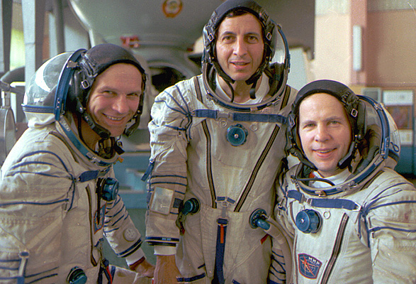 На первой тренировке совместного российско-французского экипажа (слева направо): бортинженер С. В. Авдеев, французский космонавт М. Тонини, командир экипажа А. Я. Соловьев.