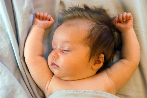 Здоровый малыш обычно спит с поднятыми вверх ручками.