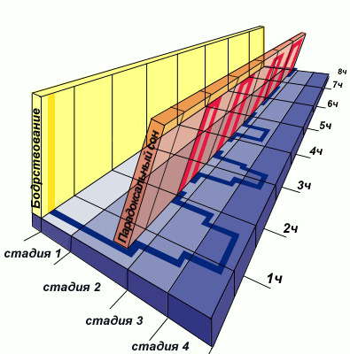 Трехмерная гипнограмма сна человека. При засыпании человек погружается в фазу медленного сна, последовательно проходя 4 стадии: дремоту (1), поверхностный сон (2), сон умеренной глубины (3) и глубокий сон (4). Потом следует резкий переход в фазу парадоксального сна, которая занимает около 20% времени сна. Медленный сон и следующий за ним парадоксальный сон формируют цикл с периодом около 1, 5 часов. Нормальный ночной сон состоит из 4-6 таких циклов.