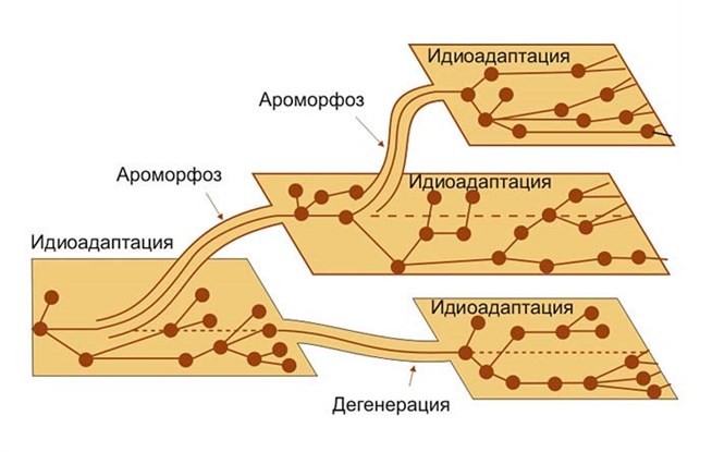 В процессе исторического развития крупных таксономических групп - типов и классов - происходит смена различных эволюционных путей. Новые высокоорганизованные группы возникают путем ароморфозов, а далее эволюция идет по пути идиоадаптации или дегенерации.