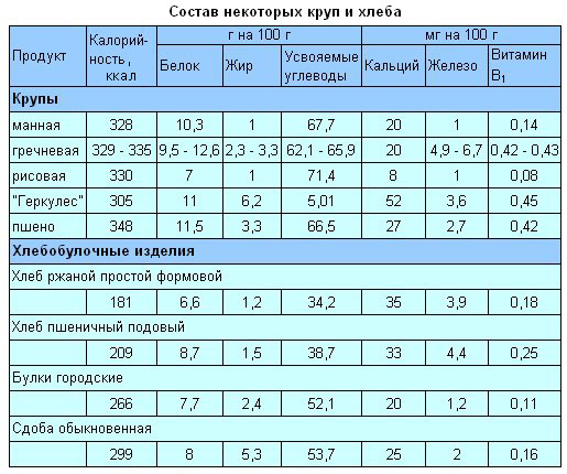 Состав некоторых круп и хлеба.