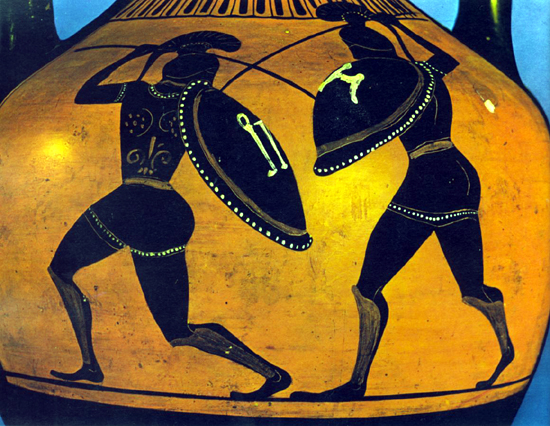 Состязания двух гоплитов в полном вооружении. Рисунок на панафинейской амфоре. 530 до н. э. Мадрид, Национальный археологический музей.