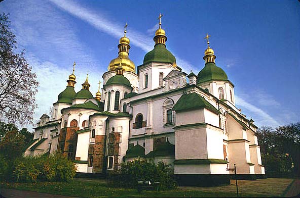 Киев. Софийский собор (собор Св. Софии). Выдающийся памятник древнерусской архитектуры 11 в. Пятинефный с пятью апсидами 13-главый крестово-купольный храм, заложенный в 1037, выстроен преимущественно из кирпича-плинфы и с трех сторон окружен 2-ярусными галереями, в которые встроены две башни с лестницами, ведущими на хоры. В конце 17 — начале 18 вв. собор был перестроен и приобрел черты украинского барокко. В интерьере сохранились мозаики и фрески 11 в. Живописное украшение храма в целом следовало византийским образцам. Характерно необычное для Византии сочетание в Софии Киевской мозаики и фрески, видимо, продолжающей традицию живописного оформления Десятинной церкви эпохи Владимира. Одним из центральных в храме является мозаичное изображение Богоматери в алтаре в виде оранты — фигуры с воздетыми руками.