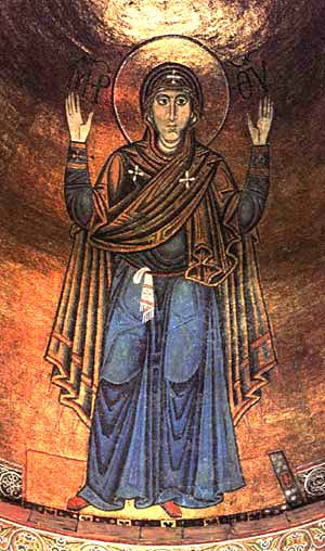 Богоматерь Оранта. Мозаика в апсиде собора святой Софии в Киеве. 1037-1050. Одним из центральных в храме святой Софии является мозаичное изображение Богоматери в виде оранты — фигуры с высоко поднятыми руками. Этот образ прежде всего привлекает внимание входящего в храм. Спокойный и торжественный лик Богоматери, жест поднятых рук воспринимаются как олицетворение заступничества и защиты.