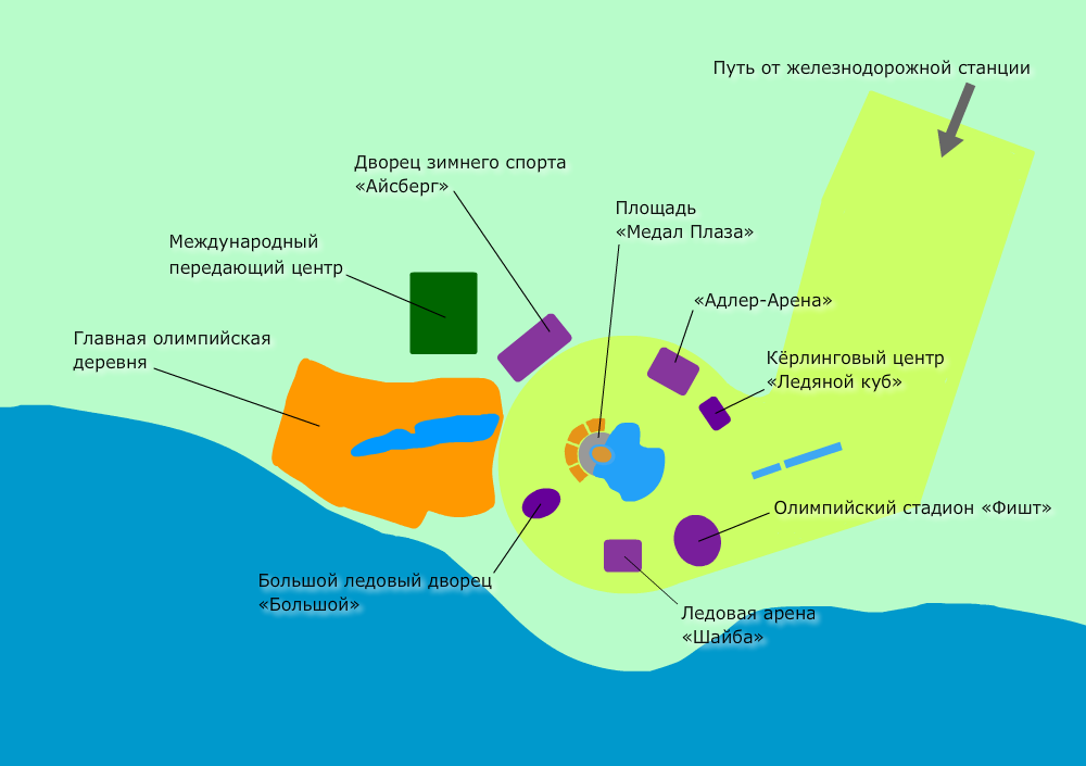 Схема размещения объектов в «Олимпийском парке» Сочи.