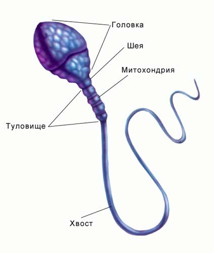 Мужская половая клетка – сперматозоид – имеет головку, содержащую ядро, шейку, в которой расположены митохондрии, и хвост – жгутик – обеспечивающий подвижность.