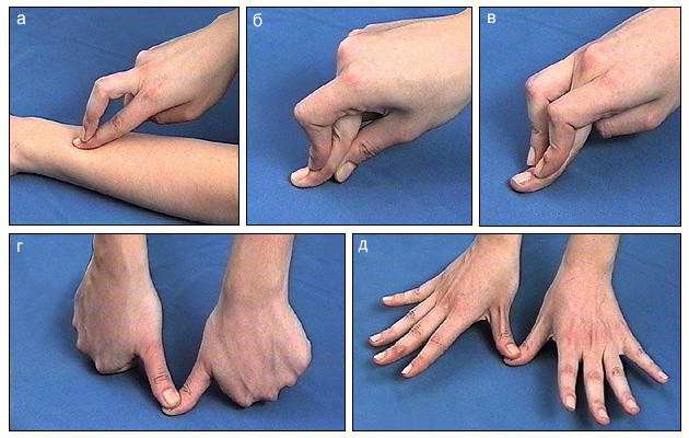 Степень пальцевого давления: а) слабое — указательным и средним пальцами; б) среднее — средним и большим пальцами; в) сильное — тремя пальцами; г), д) сильное — двумя большими пальцами.