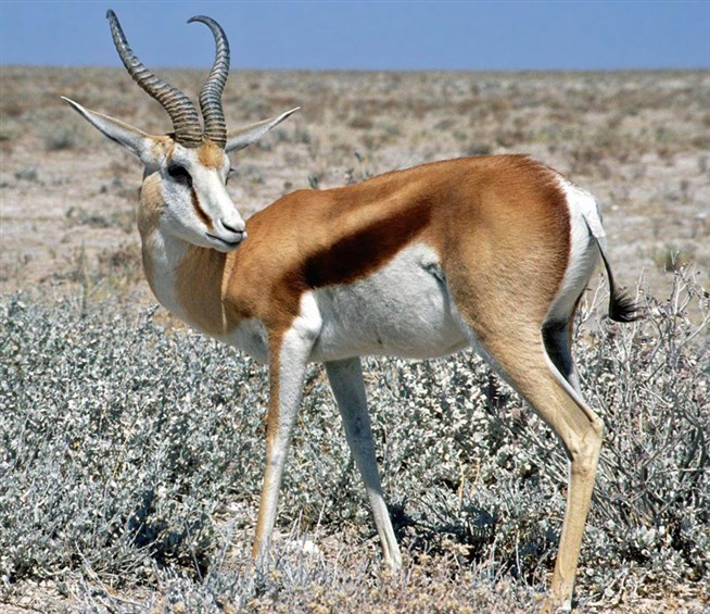 Спрингбок (Antidorcas marsupialis) из рода спрингбоков подсемейства настоящих антилоп (Antilopinae). Намибия.