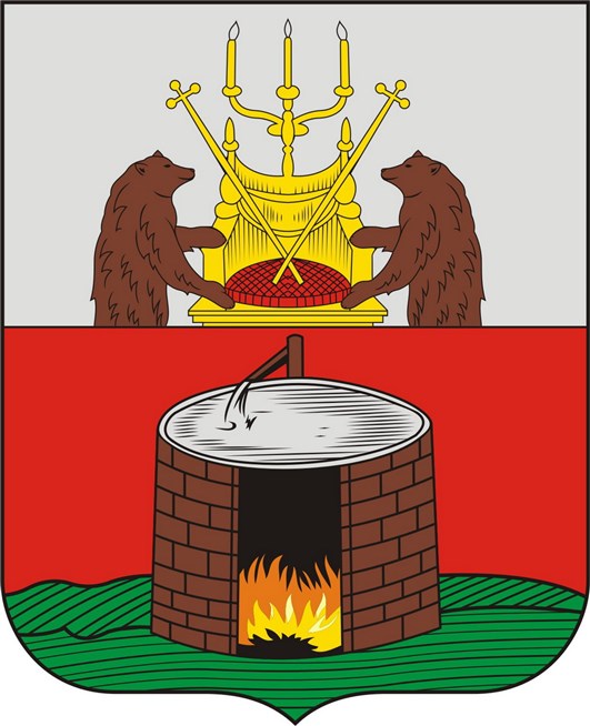 Описание: В верхней части щита герб Новгородский; в нижней — в красном поле железная сковорода, на которой варится соль, поставленная на кирпичной разожжённой печке, понеже в сём городе имеются знатныя соляные варницы.