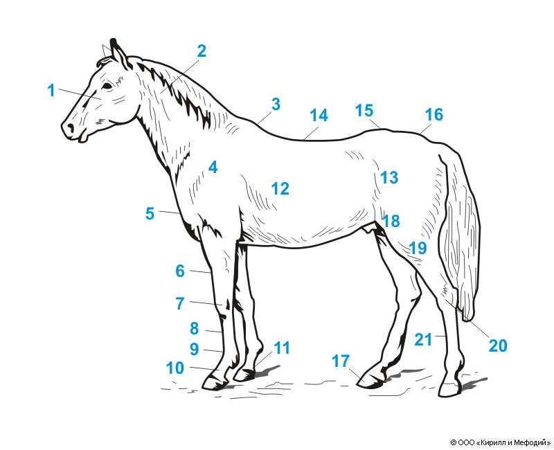 Основные стати лошади: 1 - голова; 2 - шея; 3 - холка; 4 - лопатка; 5 - плечелопаточное соединение; 6 - предплечье; 7 - запястье; 8 - пясть; 9 - путовый сустав; 10 - путо, или бабка; 11 - венчик; 12 - грудная клетка (ребра); 13 - бедро; 14 - спина; 15 - поясница; 16 - круп; 17 - копыто; 18 - коленный сустав; 19 - голень; 20 - скакательный сустав; 21 - плюсна.