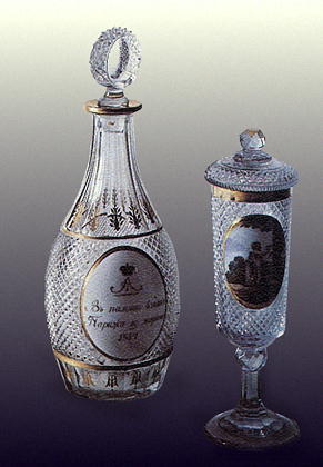 Хрустальные предметы, изготовленные в память взятия Парижа в 1814 году. Хрусталь, молочное стекло, алмазная грань, позолота. 1814 год. Императорские заводы.