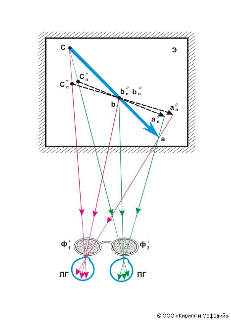 Наблюдение стереоизображения зрителем через сепарирующие очки. Левый глаз зрителя ЛГ видит через фильтр Ф'1 на экране Э изображения a''л b''л c''л, а правый глаз ПГ — через Ф'2 изображение a''п b''п c''п. Точка а предмета представляется зрителю расположенной в пространстве перед экраном на пересечении визирных осей, идущих от левого глаза к точке a''л и от правого к точке a''п. Точка b воспринимается лежащей в плоскости экрана, а точка c — в заэкранном пространстве.