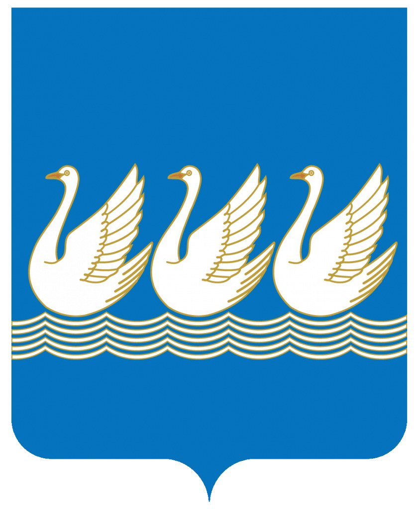 Описание: В лазоревом поле с пониженным серебряным волнистым четырехкратно пересеченным лазоревым поясом три плывущих серебряных гуся с червленым клювом.