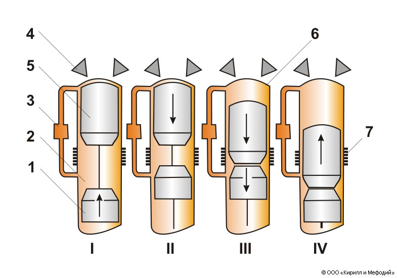 Схема работы двигателя Стирлинга: I — такт сжатия; II — такт нагревания; III — рабочий ход; IV — такт охлаждения; 1 — рабочий поршень; 2 — холодная полость; 3 — регенератор; 4 — форсунки (горелки); 5 — поршень-вытеснитель; 6 — горячая полость; 7 — охладитель.