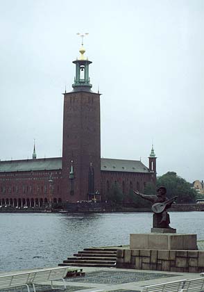 Стокгольм. Для шведской столицы характерна городская скульптура. На фото: фигура современного барда Эверта Тоба. На заднем плане здание городской ратуши.