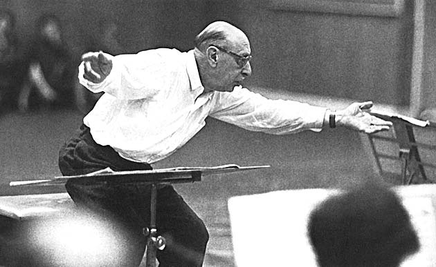 Игорь Стравинский на репетиции с симфоническим оркестром студии Би-Би-Си. 1958 год.