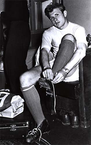 Восемнадцатилетним пареньком Эдуард Стрельцов был включен в состав советской сборной. Редкий случай. Стрельцов обещал быть выдающимся футболистом. Но его футбольная карьера сложилась трагически. Из-за нелепой истории (обстоятельства которой до сих пор остаются невыясненными) у футболиста был перерыв в шесть лет. Шесть лет без футбола для игрока такого уровня — трагедия. И все же он сумел вернуться в большой футбол и дописать свою собственную страницу в его истории. На снимке: юный Эдуард Стрельцов перед матчем (1957).