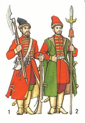 Стрельцы: 1 — стрелец; 2 — стрелецкий сотник. 2-я пол. 17 в.