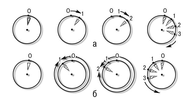 Стробоскопический эффект. Вращающееся колесо наблюдается в моменты вспышек. Если частота вспышек f совпадает с частотой вращения спицы колеса f 1, то колесо кажется неподвижным. Если f 1 >f, вращение колеса кажется замедленным (а); если f 1 <f, кажется, что колесо вращается в обратную сторону (б).