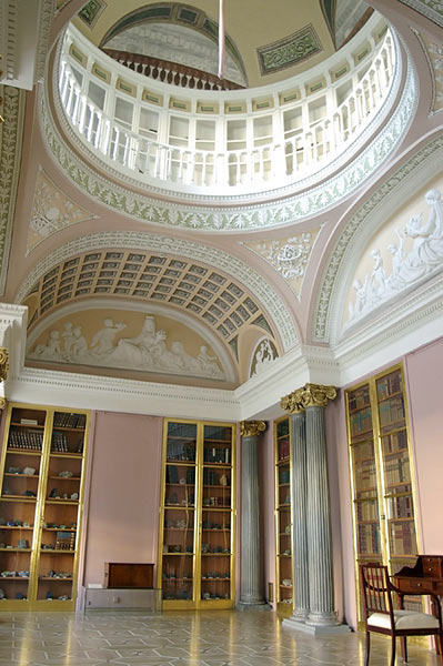 Минералогический кабинет Строгановского дворца был выполнен А. Воронихиным в 1791-1792 гг. Он предназначался для размещения книжного собрания графа А. Строганова и экспонирования коллекции минералов. Кабинет представляет собой двухярусный двусветный зал. Первый ярус декорирован барельефами, изображающими четыре стихии: огонь, воду, землю и воздух. Перспективная роспись купола выполнена в начале 19 в, предположительно П. Гонзаго. В 1950-1980 гг. в результате протечек кровли были повреждены живопись купола и интерьеры верхнего яруса. Отреставрированный кабинет был открыт 26 мая 2005.
