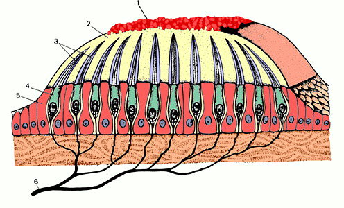 Строение отолитового аппарата: 1) отолиты; 2) отолитовая мембрана; 3) волоски рецепторных клеток; 4) рецепторные клетки; 5) опорные клетки; 6) нервные волокна.