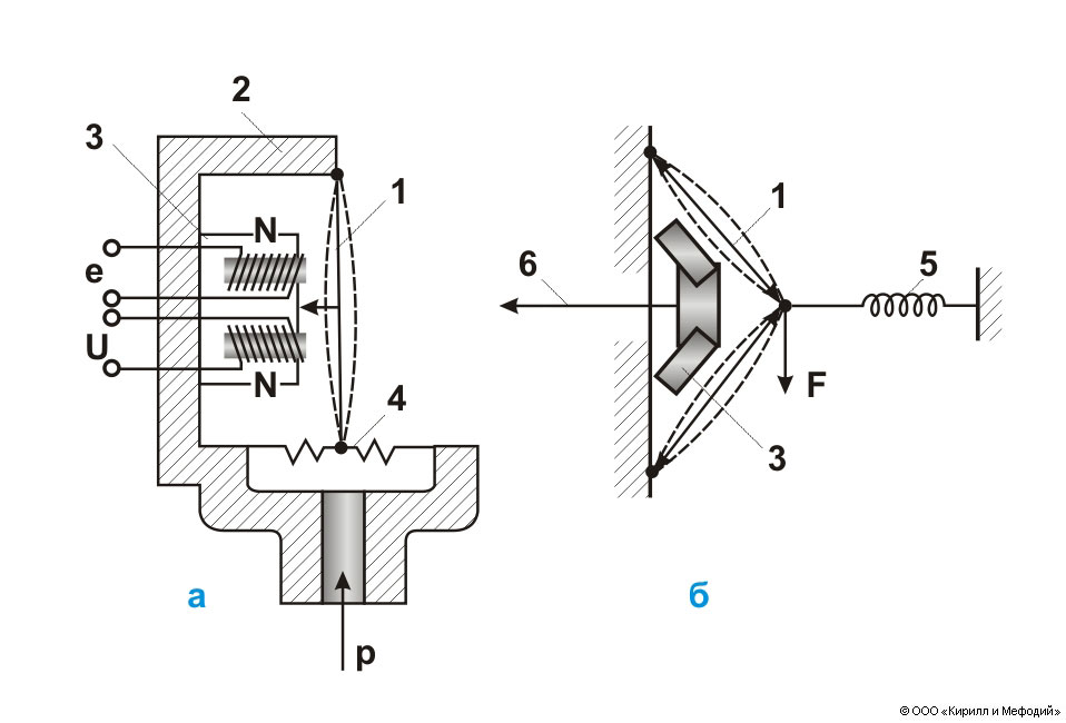 Схемы устройства струнных датчиков: а — однострунного; б — дифференциального; 1 — струна; 2 — корпус; 3 — выходной преобразователь (U — напряжение питания, е — эдс на выходе преобразователя); 4 — мембрана; 5 — пружина; 6 — выходной сигнал; р и F — измеряемые параметры (давление и усилие).