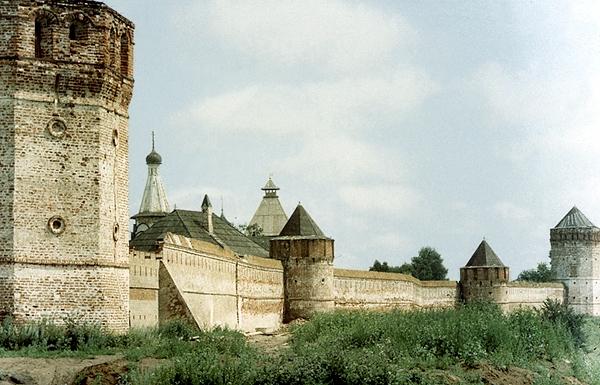 Суздаль. Крепостные стены и башни Спасо-Ефимиевского монастыря (17 в.) Каменная ограда кажется неприступной с противоположного низкого берега реки Каменки.