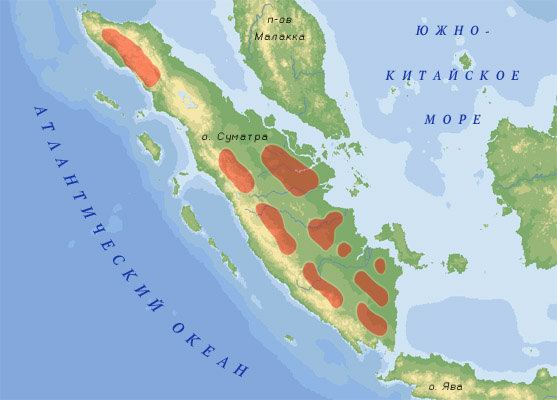 Ареал суматранского тигра. Суматранский тигр (Panthera tigris sumatrae) — подвид тигра, обитающий только на острове Суматра (Индонезия). Около 400-500 особей живут в дикой природе и 235 — в зоопарках. Для сохранения суматранского тигра организованы национальные парки. Это самый мелкий подвид из сохранившихся: вес взрослого самца составляет 100-140 кг.