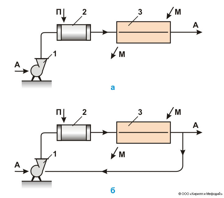 Схема конвективных сушилок: а — основной вариант; б — с рециркуляцией части отработанного воздуха; А — сушильный агент; П — греющий пар; М — высушиваемый материал; 1 — вентилятор; 2 — калорифер; 3 — сушильная камера.