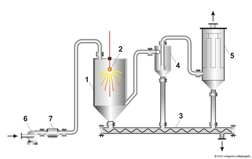 Распылительная сушилка: 1 — камера сушки; 2 — форсунка; 3 — шнек для выгрузки высушенного материала; 4 — циклон; 5 — рукавный фильтр; 6 — вентилятор; 7 — калорифер.