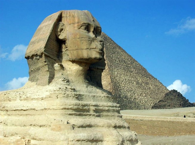 Большой Сфинкс на фоне пирамиды Хеопса.