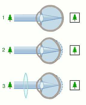 Схема формирования изображения при дальнозоркости: (1) в нормальном глазу; (2) в дальнозорком глазу; (3) в дальнозорком глазу с коррекцией очками.