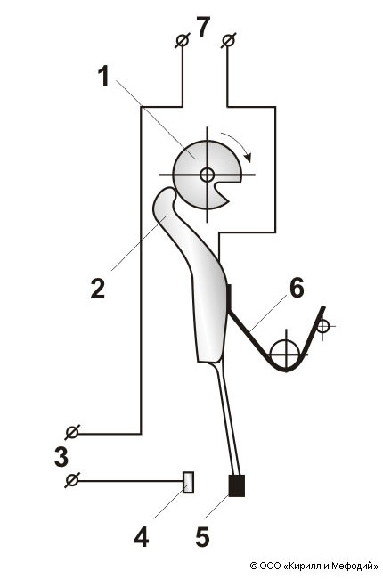 Схема таймера однократного действия с часовым механизмом, используемого для подключения бытовых приборов (радиоприемника, телевизора, электроплитки и т. п.) к электросети: 1 — профилированный кулачок на валу часового механизма; 2 — рычаг, при перемещении которого (в результате попадания головки в вырез кулачка) замыкаются подвижный контакт 5 с неподвижным 4; 3 — гнезда для подключения электроприбора к таймеру; 6 — пружина, прижимающая рычаг к кулачку; 7 — гнезда для подключения таймера к электросети.
